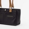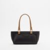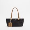 Black Iceberg Jeans handbag with camel leather handle and metallic lettering on the front. Features a metallic pendant detail.