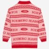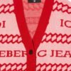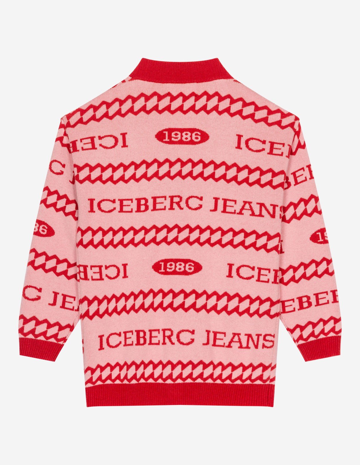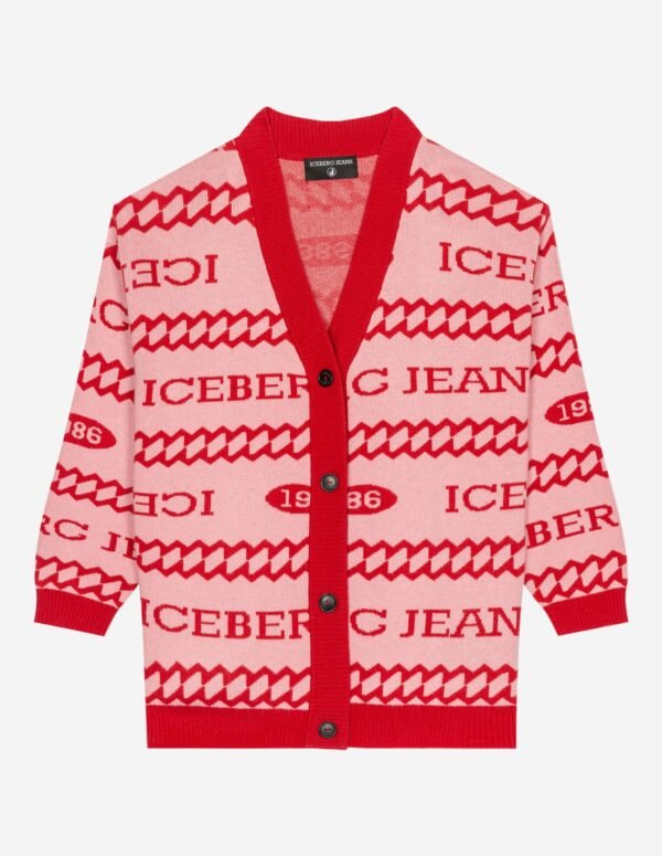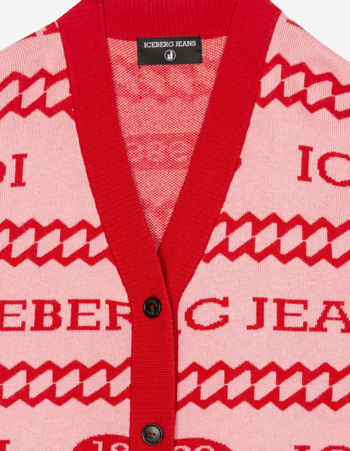 Oversized pink cardigan with a red jacquard Iceberg Jeans logo. V-neck and button closure.