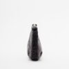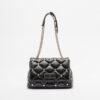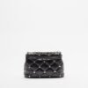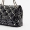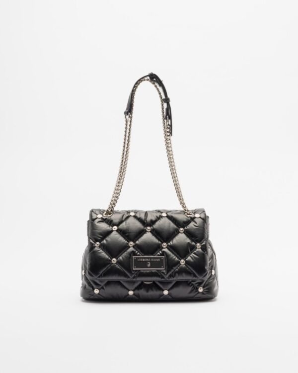 Black nylon bag with a quilted effect and exclusive silver stud detailing. Chain strap and metal logo plate on the front.