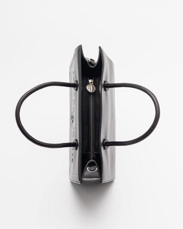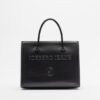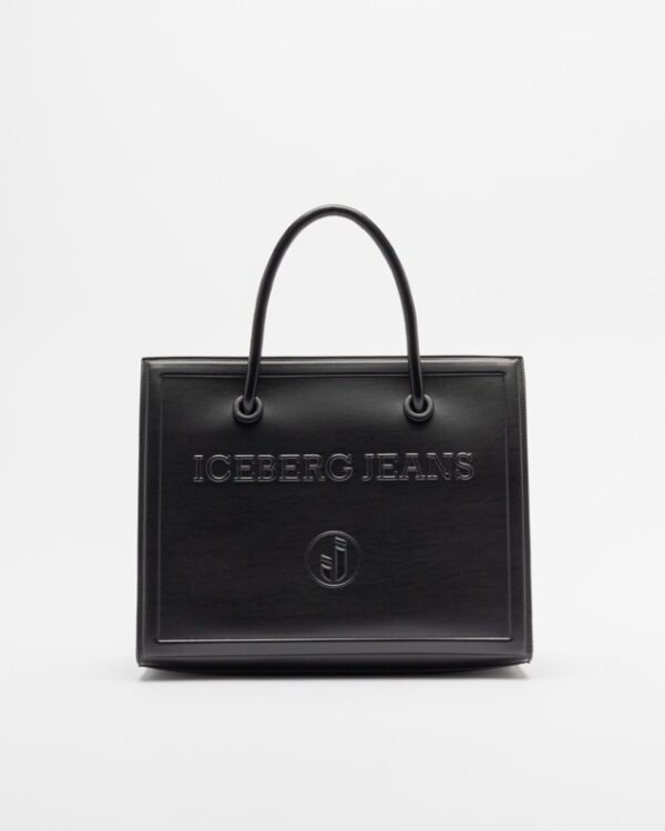Black square-shaped bag made of synthetic leather with the Iceberg logo embossed on the front.