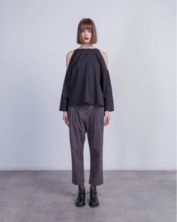 Ixos black shirt with open shoulders and hidden button closure on the back.