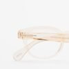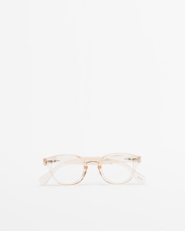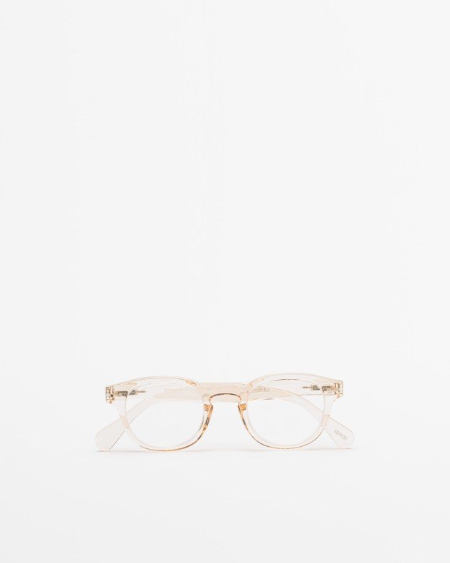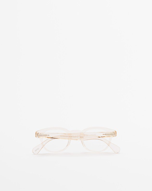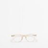 Square reading glasses with transparent beige frames.