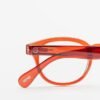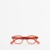 Square reading glasses with transparent red frames.
