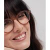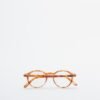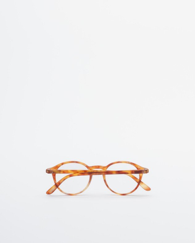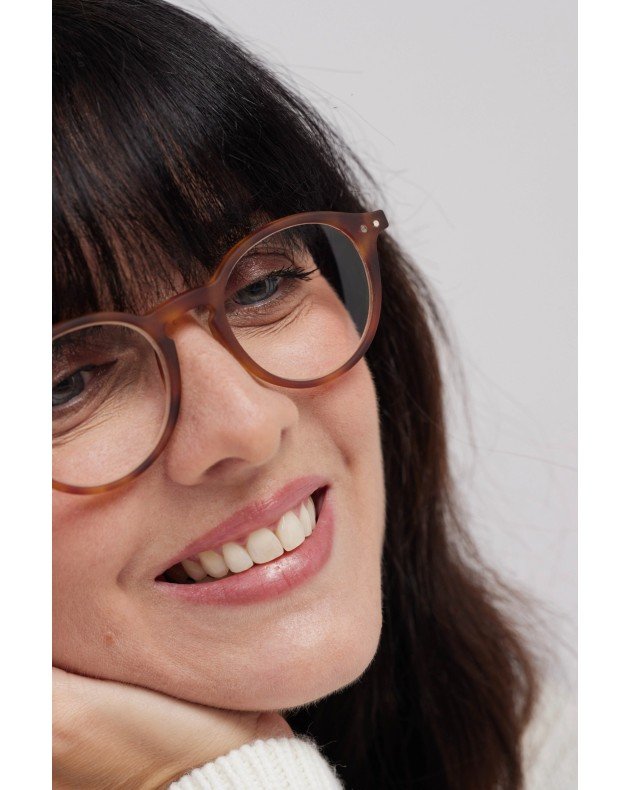 Round reading glasses for presbyopia with a camel Havana frame.