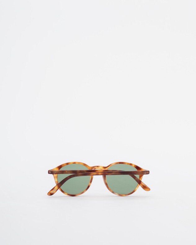 Round camel sunglasses with Havana frames.