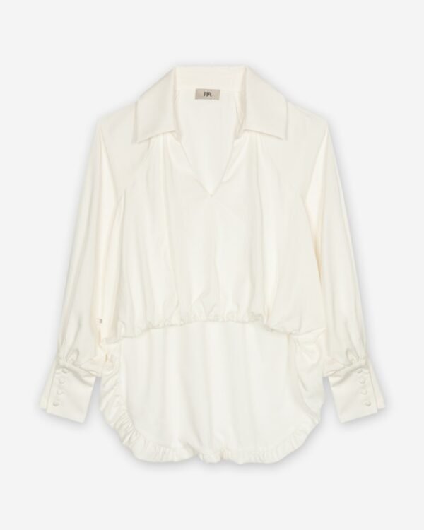 Asymmetrical white shirt with a V-neck and classic collar. Cropped at the front with a gathered hem and a longer back.