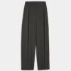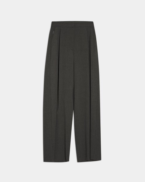 Black palazzo trousers with a high waist. Features front pleats with tailored darts and back pockets.