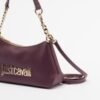 Burgundy baguette-style Just Cavalli bag in synthetic leather. Features gold metallic lettering detail on the front.
