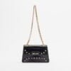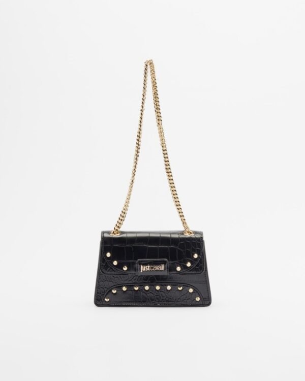 Just Cavalli black crossbody bag crafted from crocodile-effect faux leather. Featuring a Just Cavalli logo patch and gold metal studs.