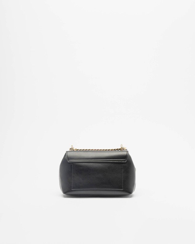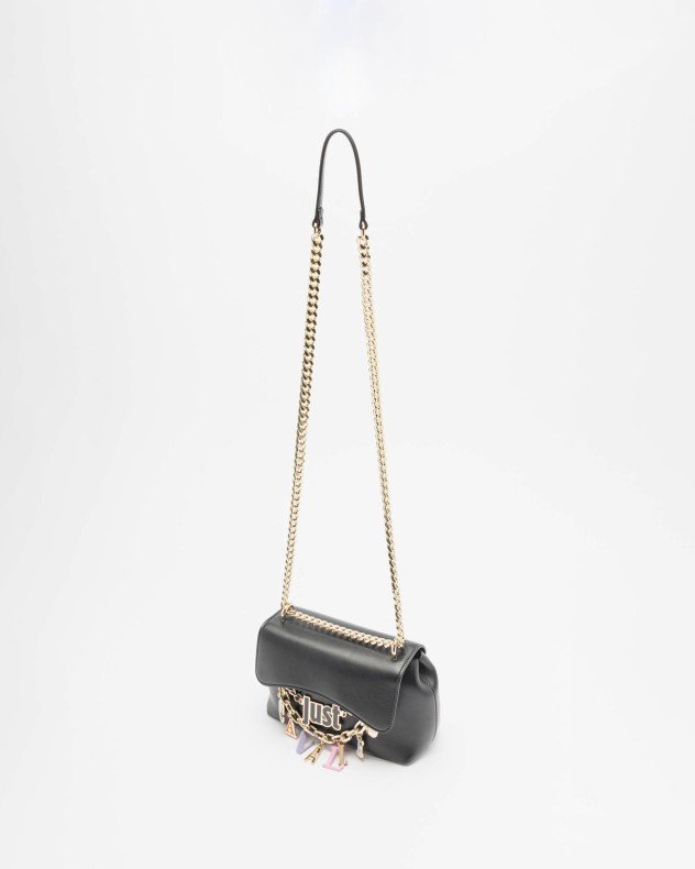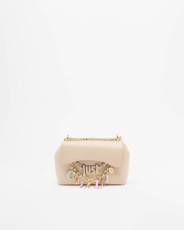 Just Cavalli light blue crossbody bag in soft, supple faux leather. Features a gold-tone metal chain detail and colorful lettering pendants.