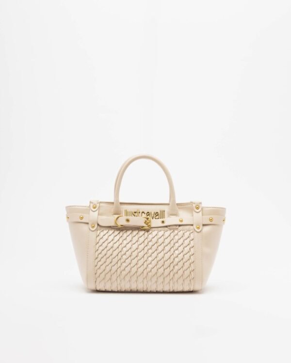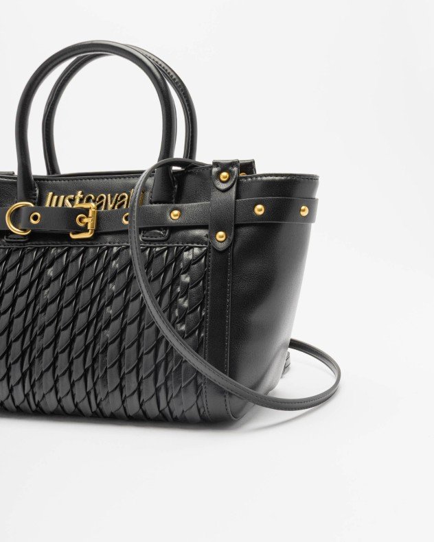 Just Cavalli black shopper bag in synthetic leather with a gathered effect panel. Gold stud detail and Just Cavalli metal logo.
