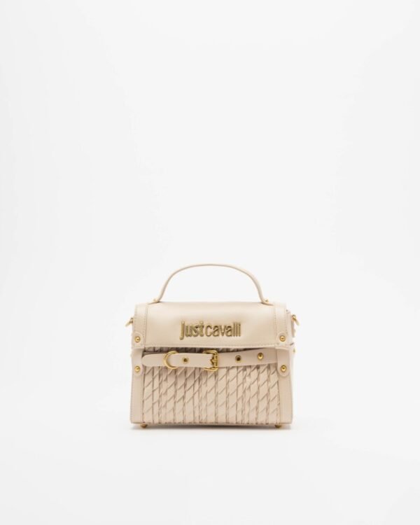 Just Cavalli black bag in soft synthetic leather. Features a gathered panel detail, gold studs, and a metal Just Cavalli logo.