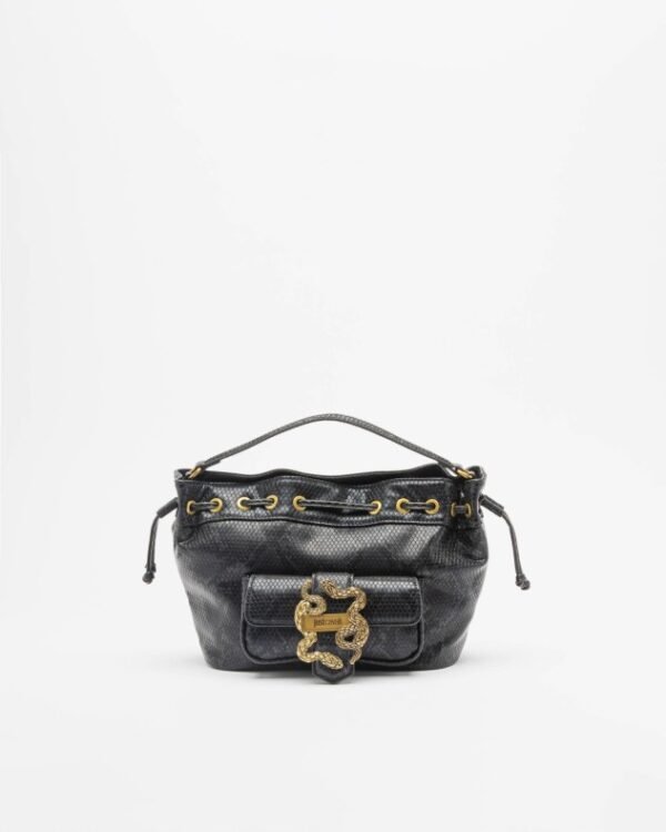 Black Just Cavalli bucket bag in synthetic leather with a snake effect. Features gold eyelet detail with drawstring and gold plate with the Just Cavalli logo.
