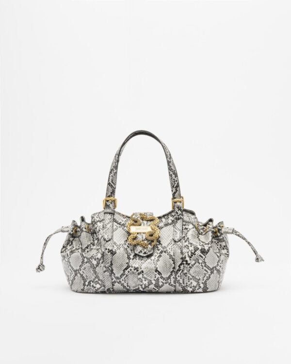 Just Cavalli shoulder bag in synthetic leather with a textured snake pattern in shades of black, white, and gray. Features a gold Just Cavalli logo plaque.