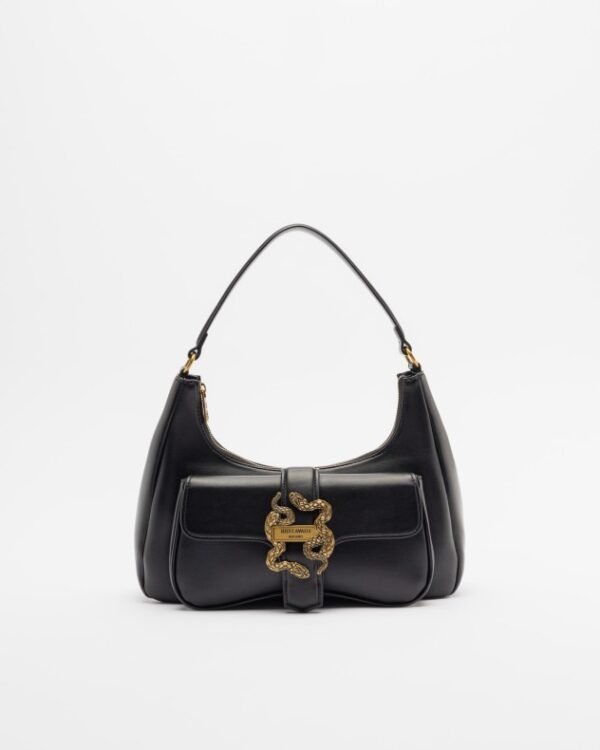 Black Just Cavalli hobo-style medium-sized bag in smooth synthetic leather. Features an exterior pocket and a gold-tone metal plate with the Just Cavalli logo.