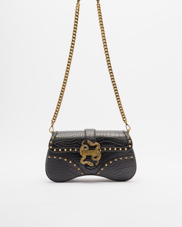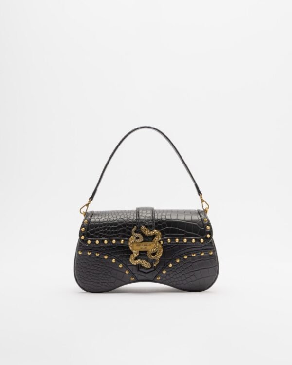 Black crocodile-embossed shoulder bag with gold stud detailing. Metallic Just Cavalli logo on the front.