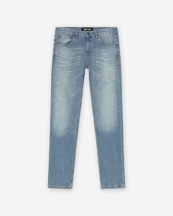 Men’s slim jeans with a washed effect and subtle rips. Embossed Just Cavalli monogram on the back pocket.