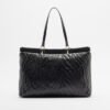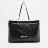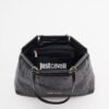 Black bag with quilted effect and stitched pattern. Metallic Just Cavalli logo on the front.