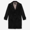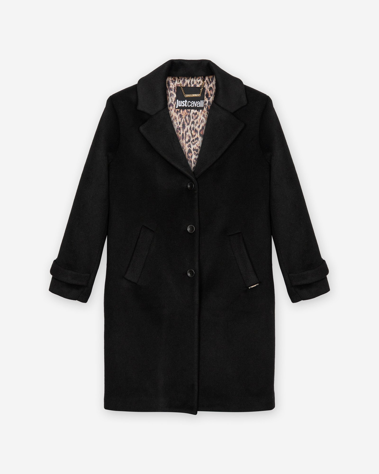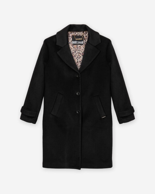 Women’s black wool blend overcoat. Designed with tiger print lining and exclusive Just Cavalli details.