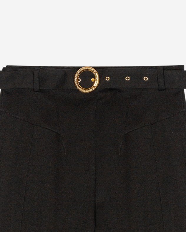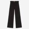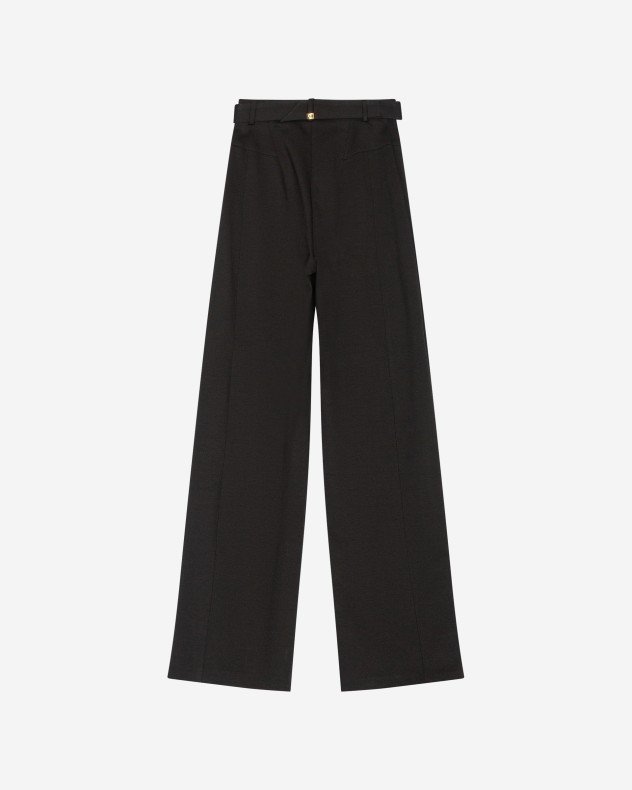 Black wide-leg trousers by Just Cavalli. High waist with exclusive gold buckle and invisible side zipper.
