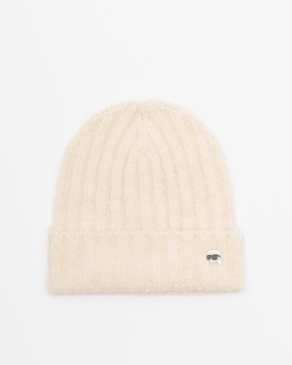 Beige Karl Lagerfeld beanie in a blend of synthetic fibers and wool with a Karl Lagerfeld pin detail.