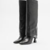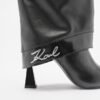 Black leather thigh-high boots with a pointed toe. The shaft features a pleated effect and Karl’s metallic signature.