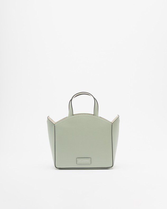 Karl Lagerfeld medium-sized green tote bag in genuine leather. Double handle. Leather patch with silver Karl Lagerfeld logo on one side and geometric shape with perforations and Karl design on the opposite side.