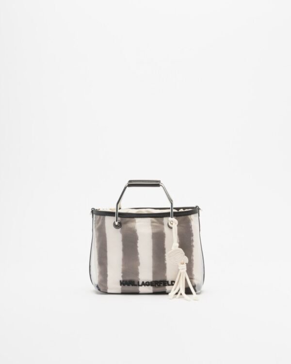 Karl Lagerfeld beach tote bag in black and white striped mesh fabric. Features an embroidered Karl Lagerfeld logo and a Karl Lagerfeld pendant.