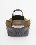 Black leather bag with perforated Karl Lagerfeld logo. Removable shoulder strap with stitched logo.