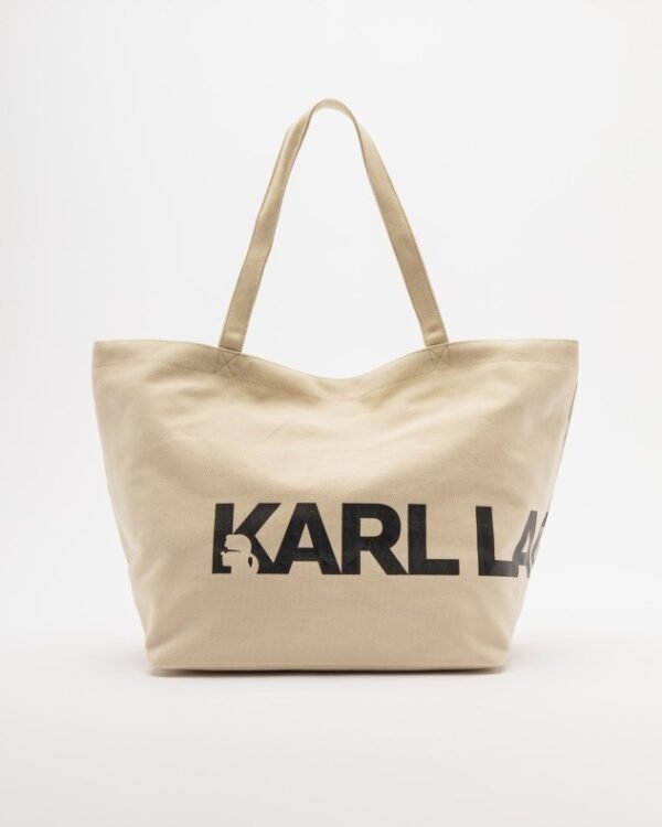 Karl Lagerfeld beige shopper bag in canvas fabric with contrasting black lettering.