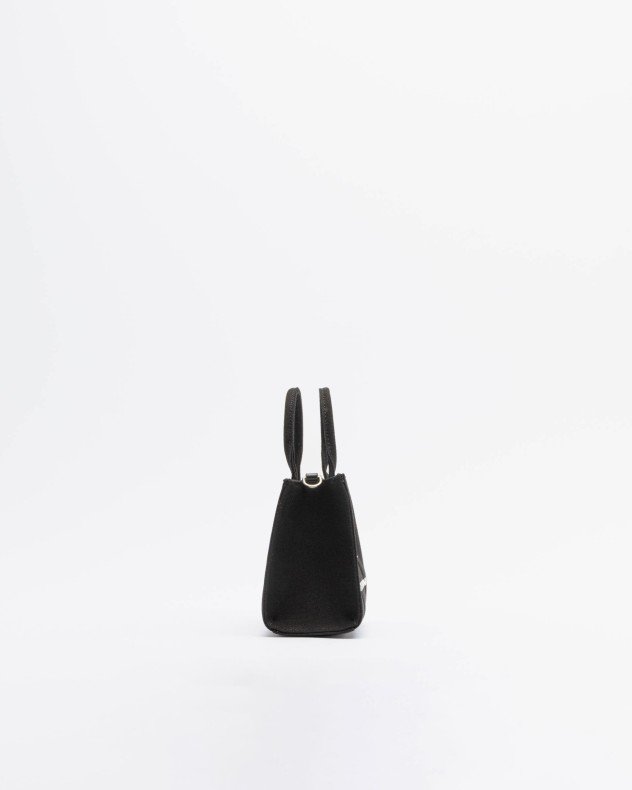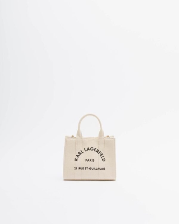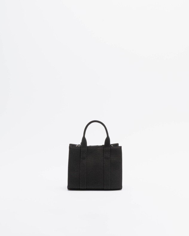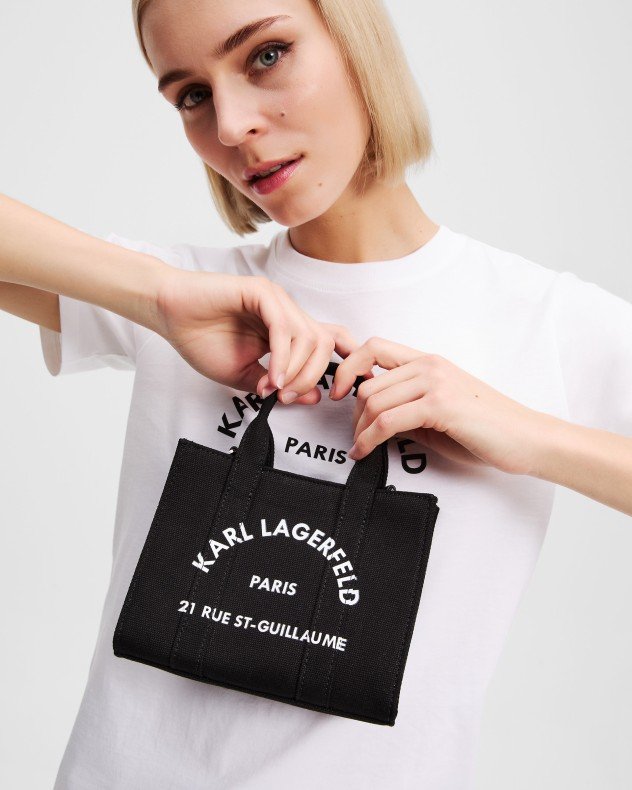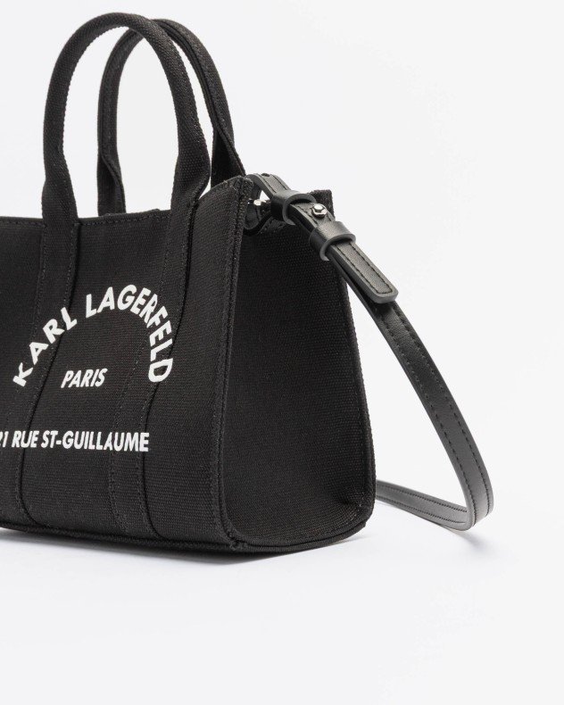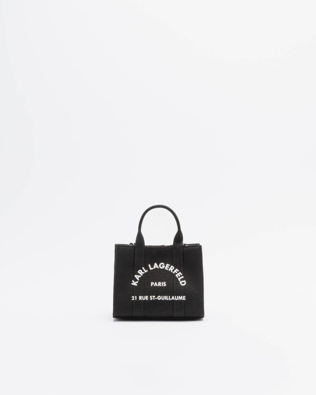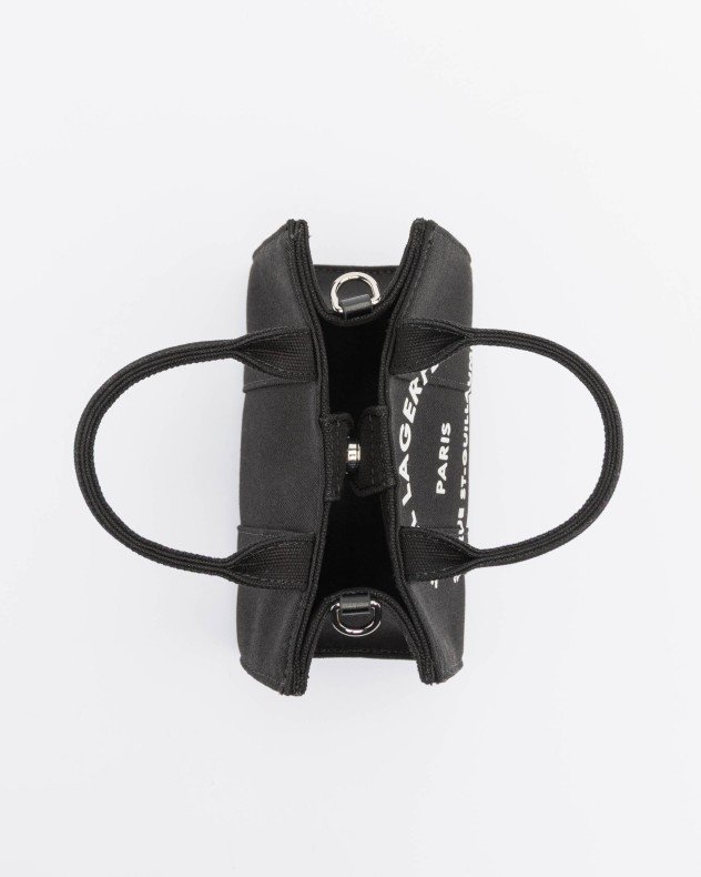 Mini black tote bag in cotton fabric with Karl Lagerfeld logo and address printed in white on the front.