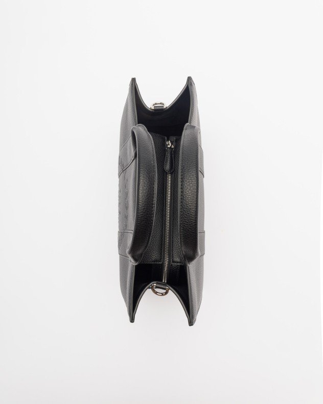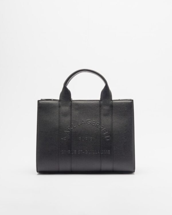 Black Karl Lagerfeld tote bag in grainy faux leather. Embossed Karl Lagerfeld address detail on the front.