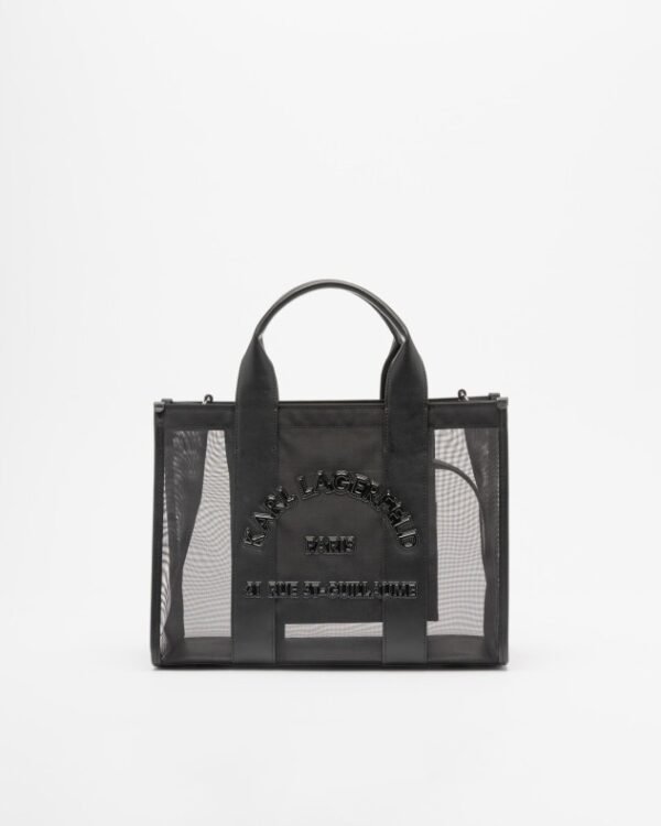 Karl Lagerfeld black tote bag in semi-transparent mesh. Exclusive Karl Lagerfeld logo and address embroidered on the front.