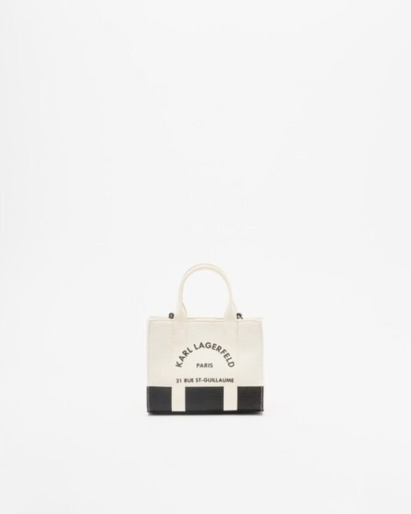 Karl Lagerfeld white and black mini tote bag in canvas fabric. Double handle and printed Karl Lagerfeld address detail (21 Rue St-Guillaume).