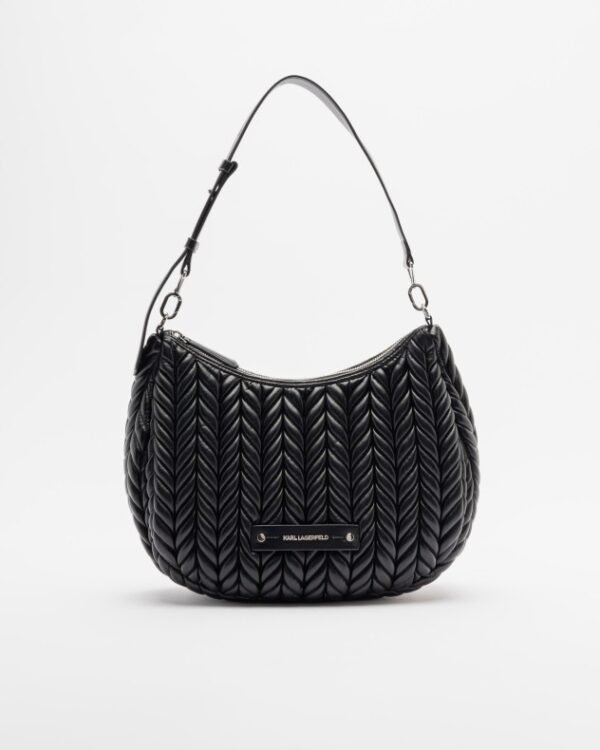 Black hobo bag with quilted design and silver metallic details. Karl Lagerfeld logo on the front.