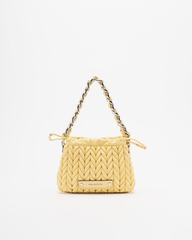 Karl Lagerfeld yellow handbag in soft synthetic leather with a quilted, interwoven effect. Leather patch with silver Karl Lagerfeld logo and chain handle.