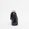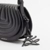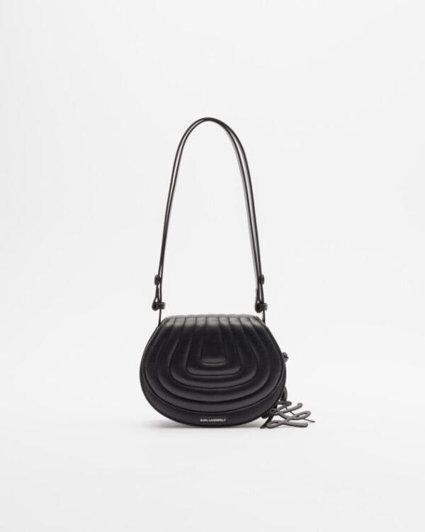 Black bag with a clamshell shape and quilted design. Metallic Karl Lagerfeld logo on the front.