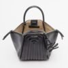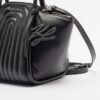 Black faux leather bag with quilted design. Metal logo on the front and Karl pendant.
