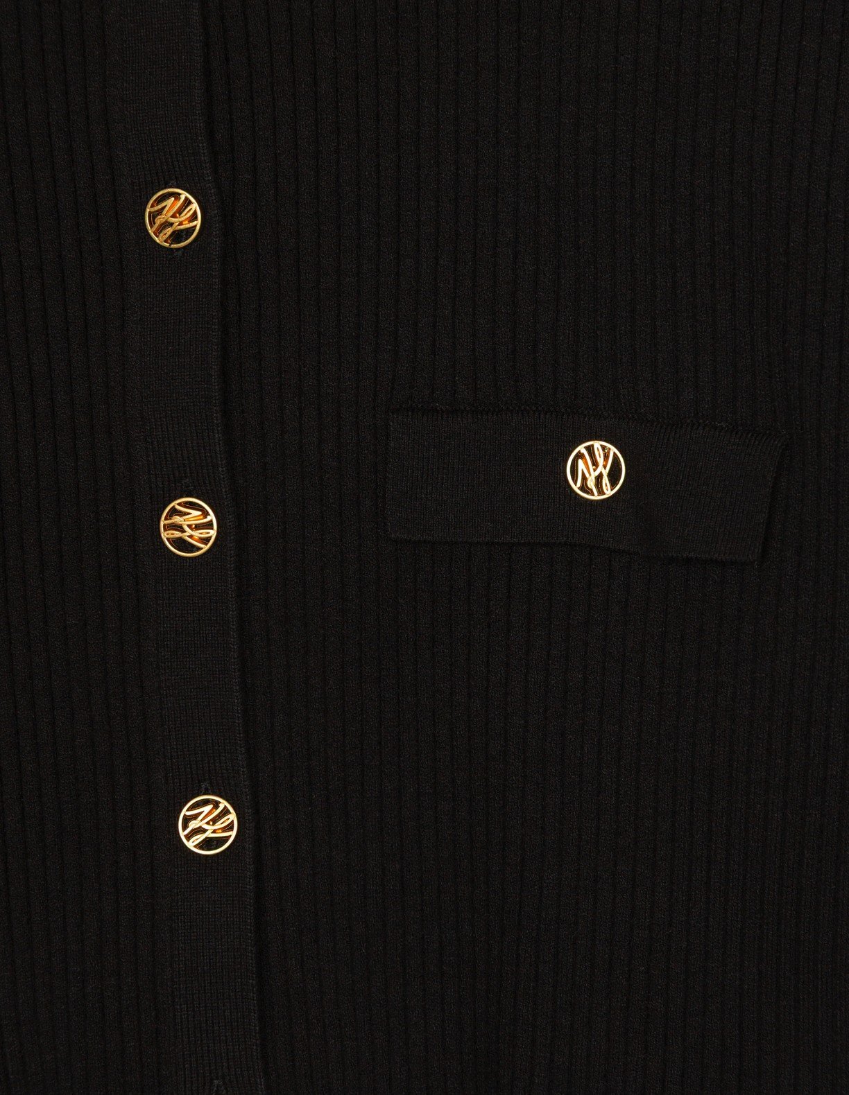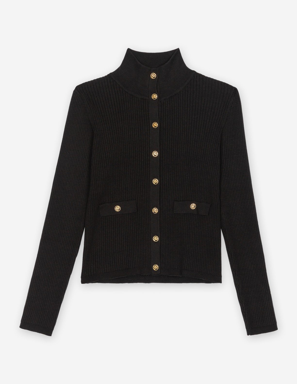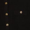 Black ribbed knit jacket. High collar design with unique gold button closure.