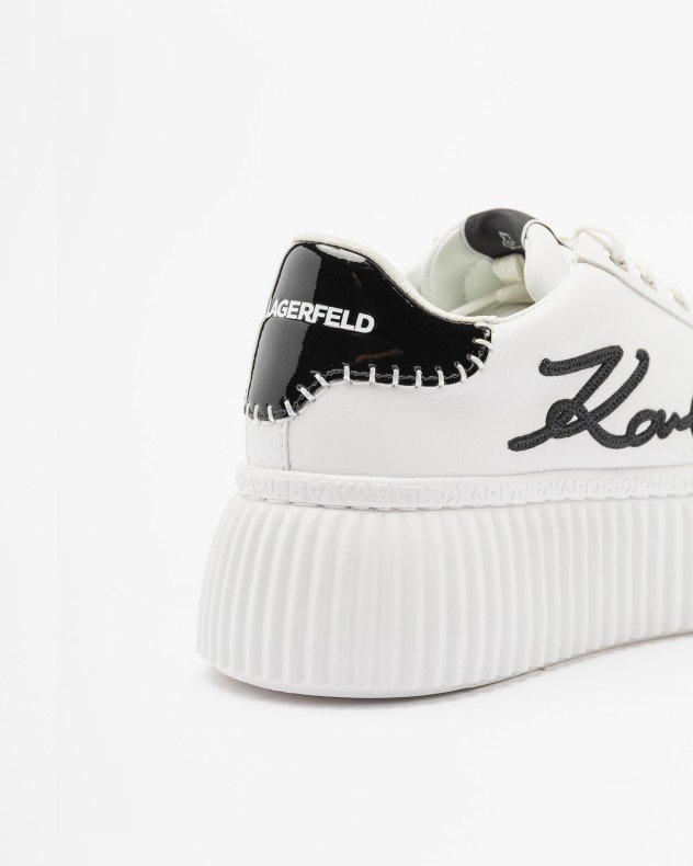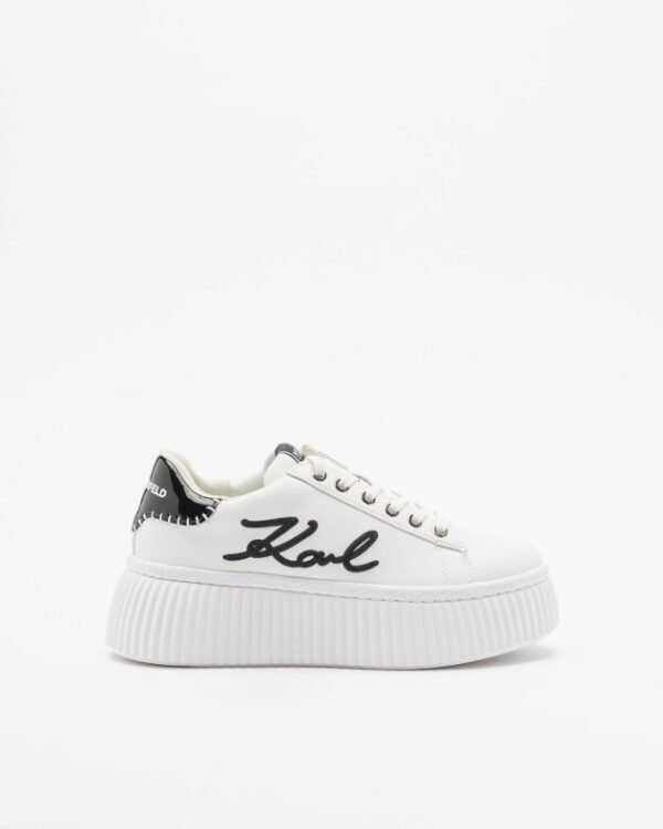 White Karl Lagerfeld sneakers with a ribbed platform sole. Contrasting patent leather heel and embroidered signature on the side.