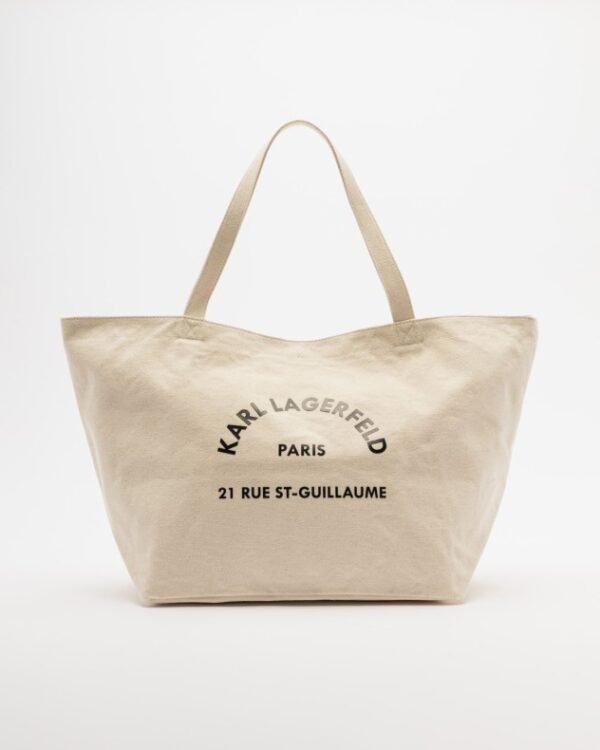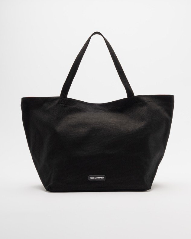 Black beach bag by Karl Lagerfeld in canvas fabric with contrasting lettering.