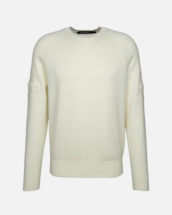 Karl Lagerfeld men’s white sweater made from 100% wool with topstitching details and embossed lettering on the right sleeve.