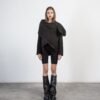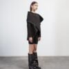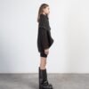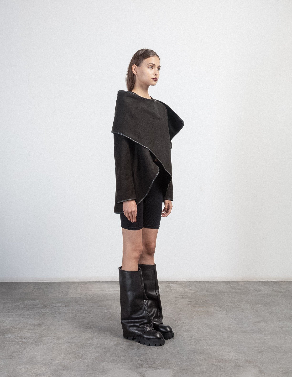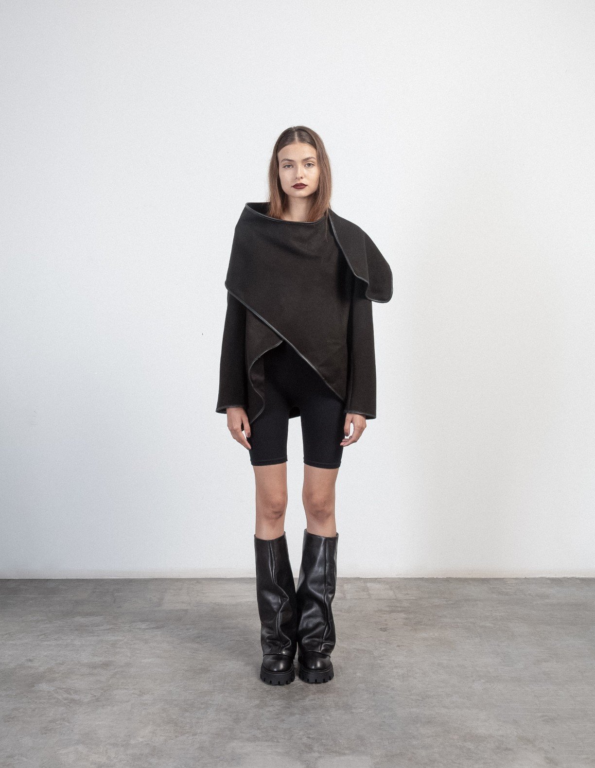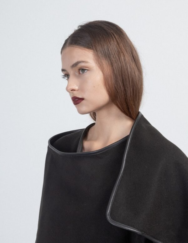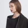 Asymmetrical black coat made from a mix of warm materials, with fur details.