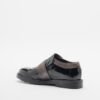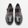 Black patent shoes with gray leather details and elastic on the instep.