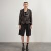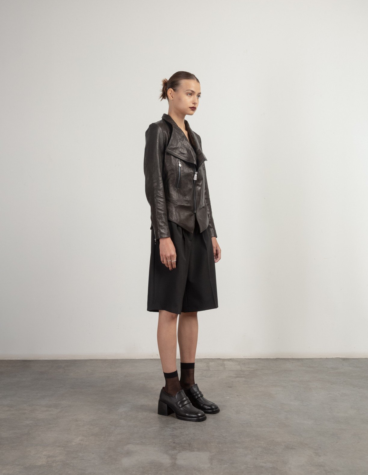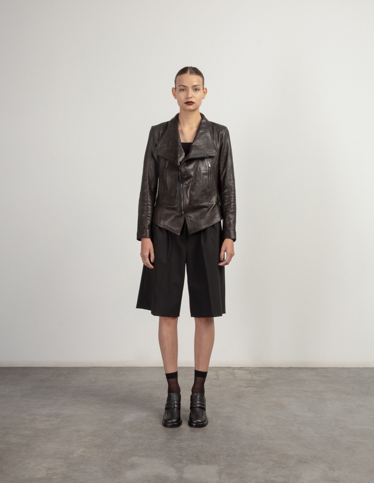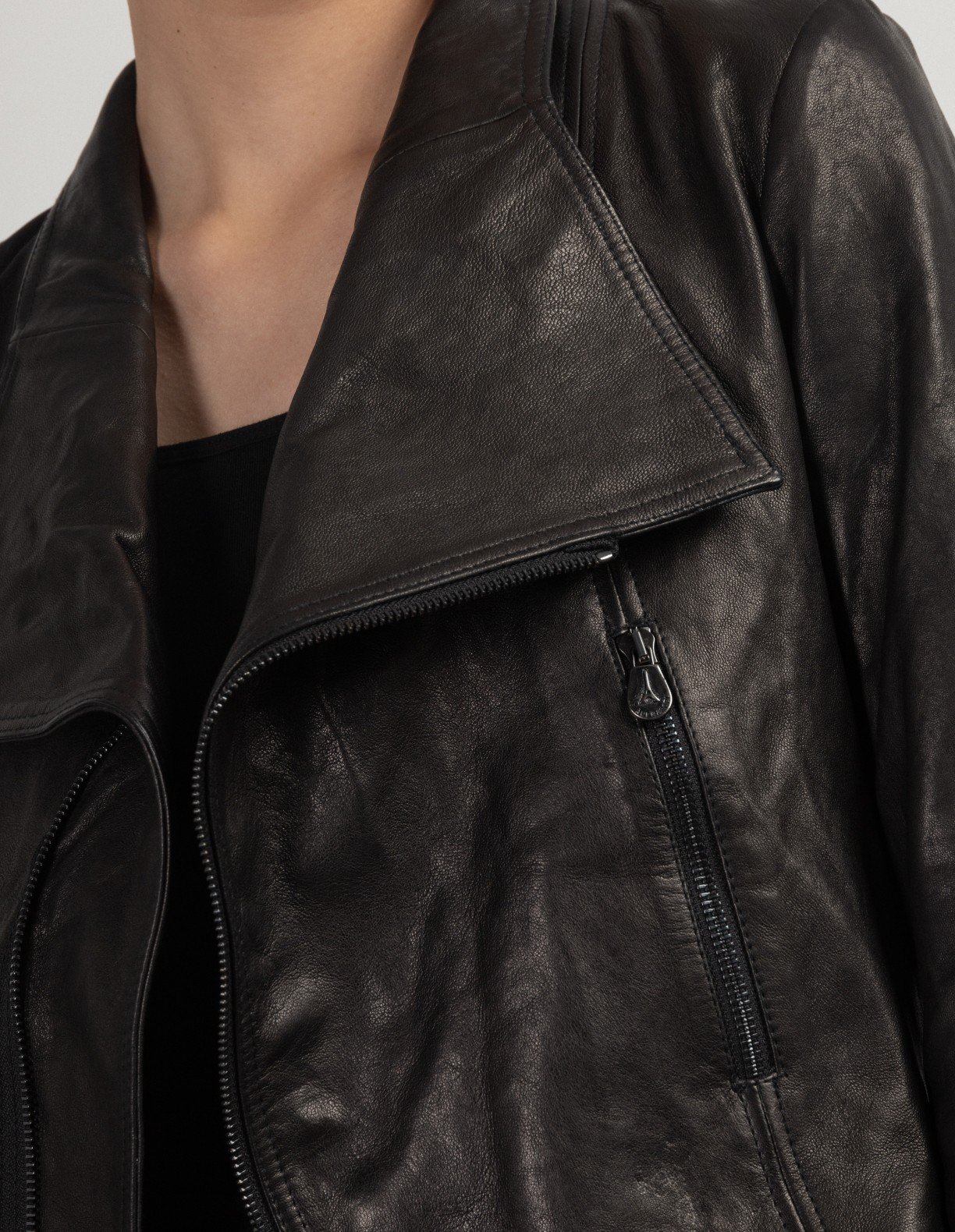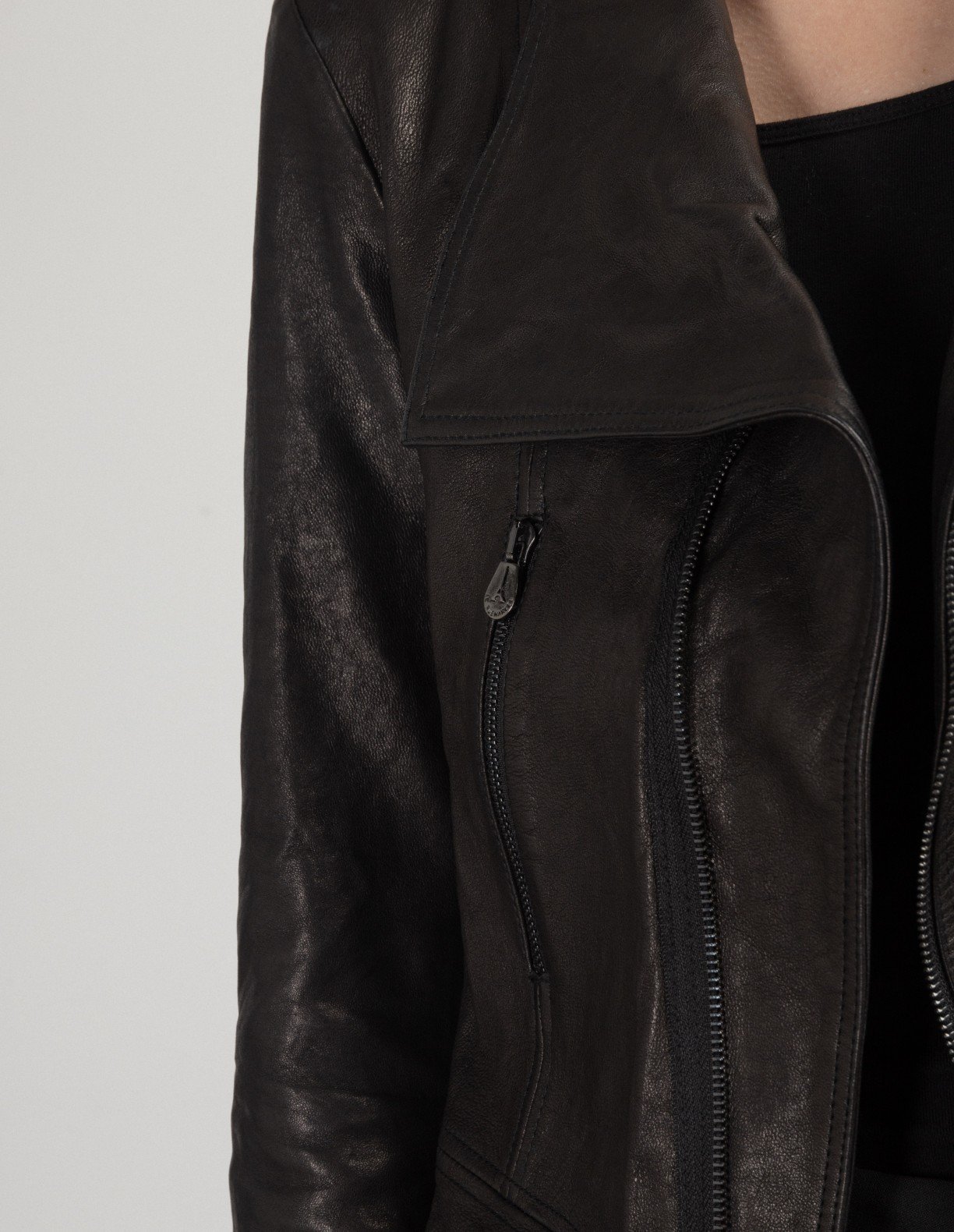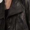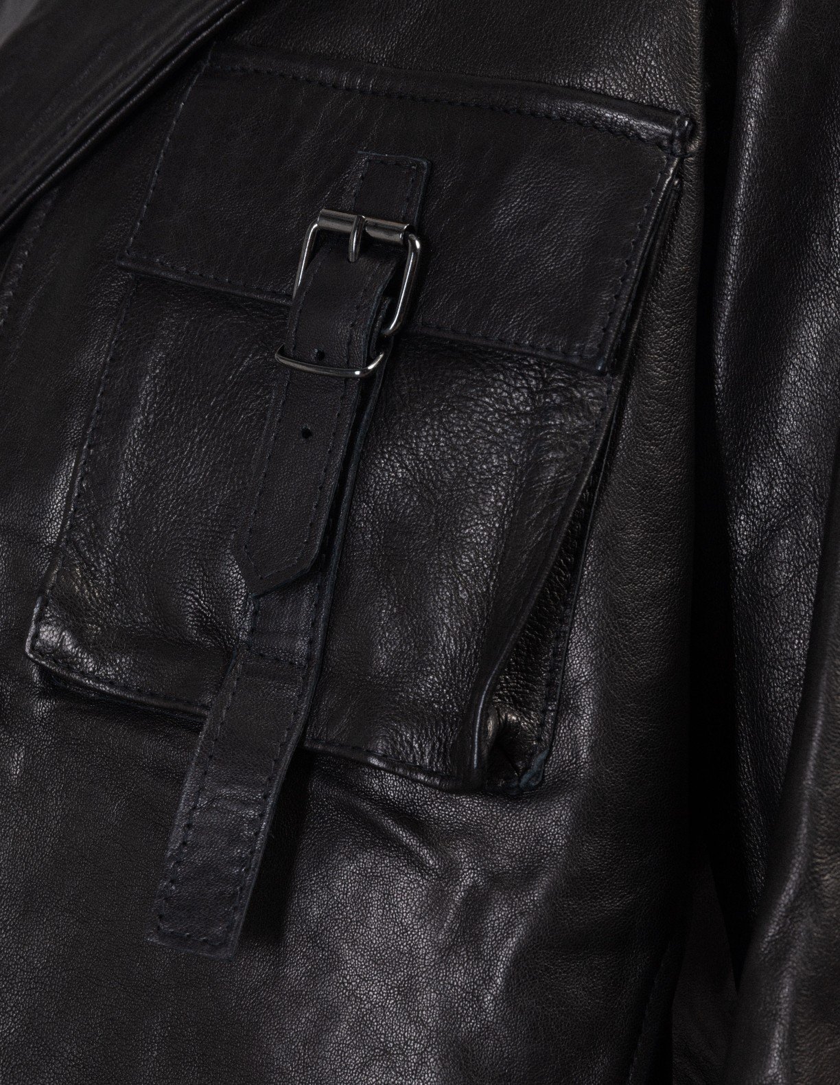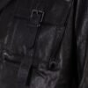 Black leather jacket with lapels and multiple fasteners.