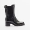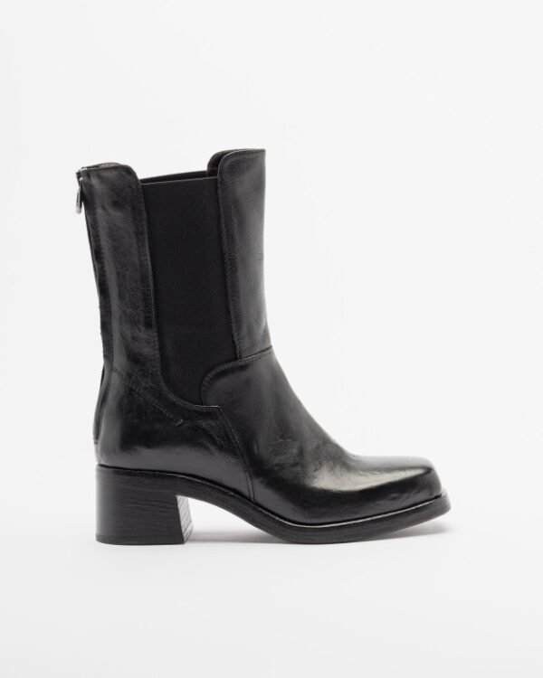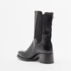 Black leather boots with a square toe and elasticated sides. Zipper closure at the back.