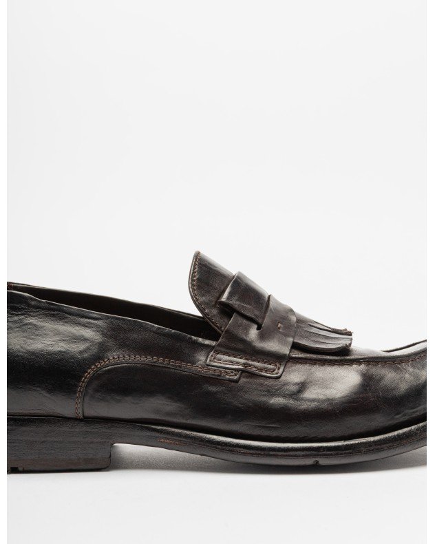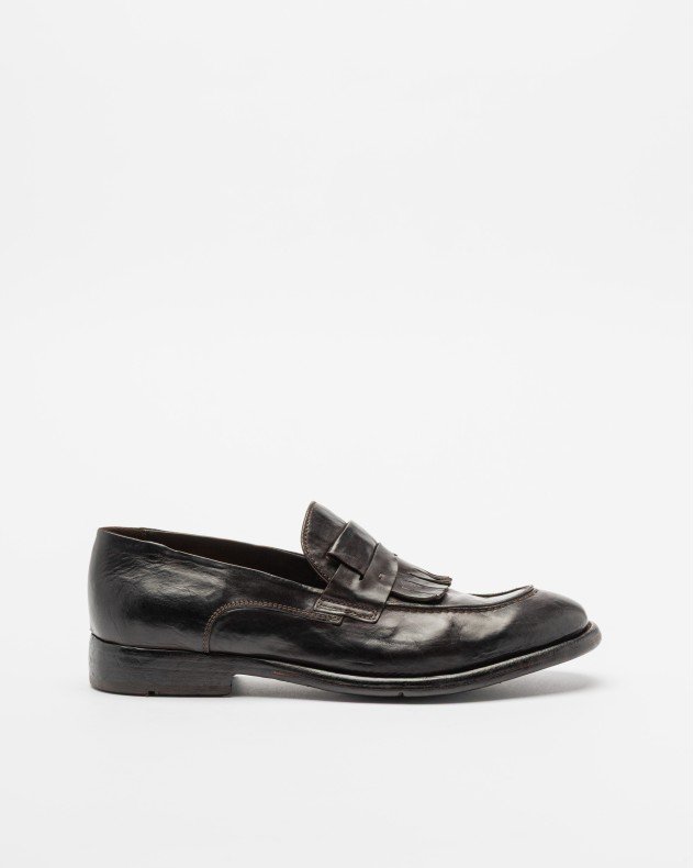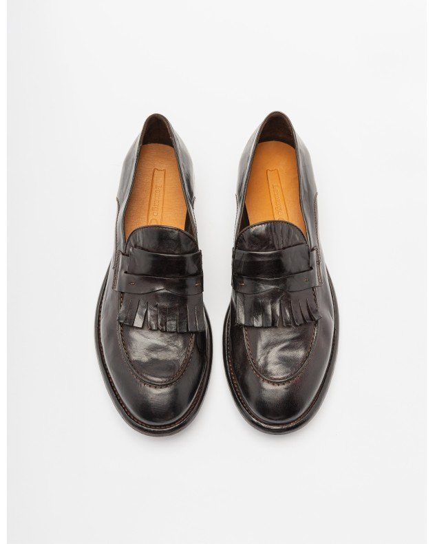 Black polished leather mocassins with an almond toe and decorative fringe detail on the front.