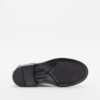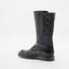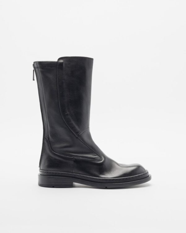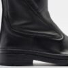 Black leather boots with a low heel, almond-shaped toe, and back closure.