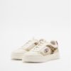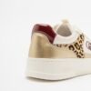 Beige Liu-Jo sneakers with gold details and a burgundy heel. Faux fur insert on the sides with a tiger print.
