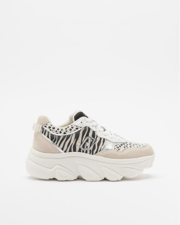 Liu-Jo sneakers with a high, chunky sole. Upper crafted from a mix of materials with a zebra pattern and silver details.